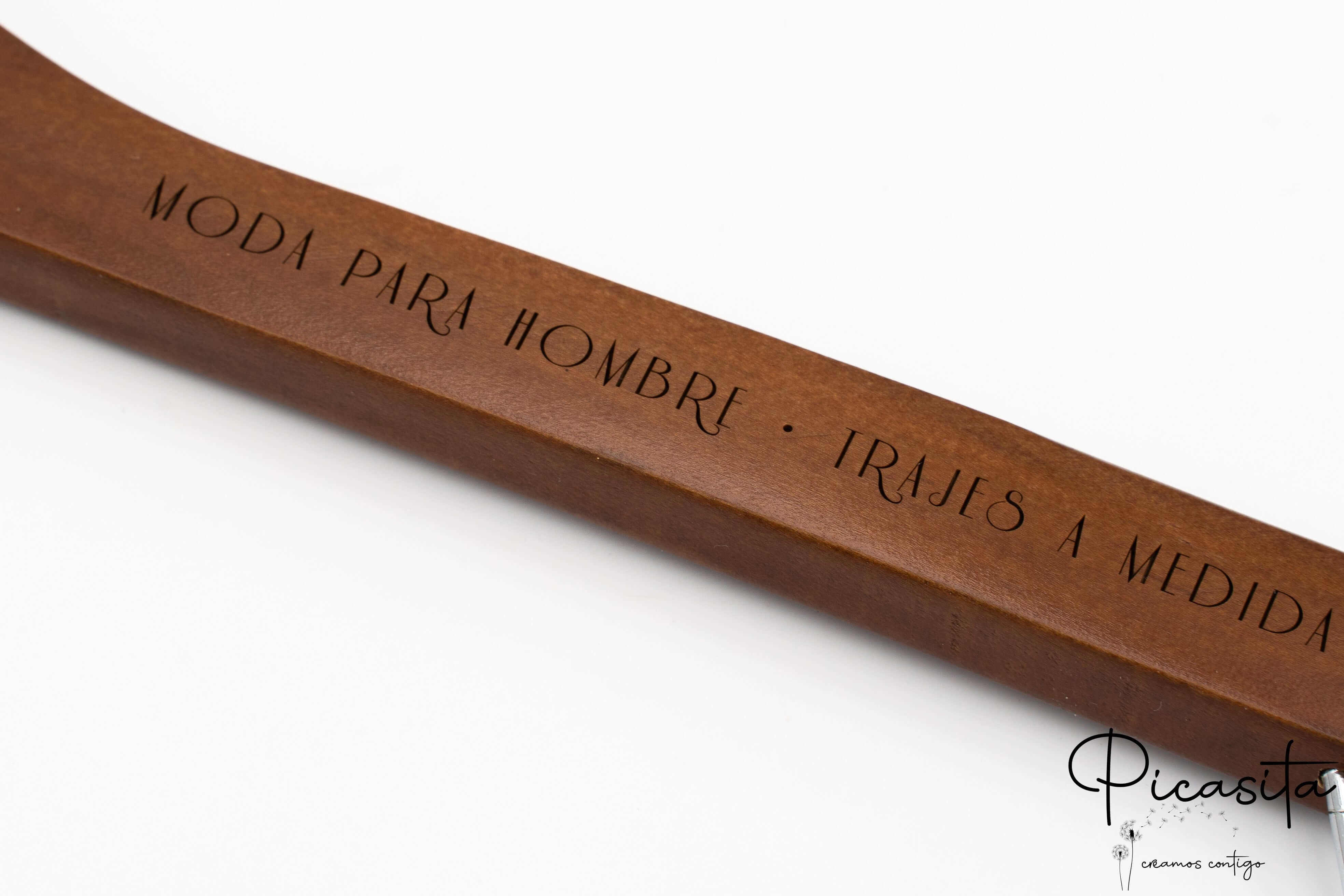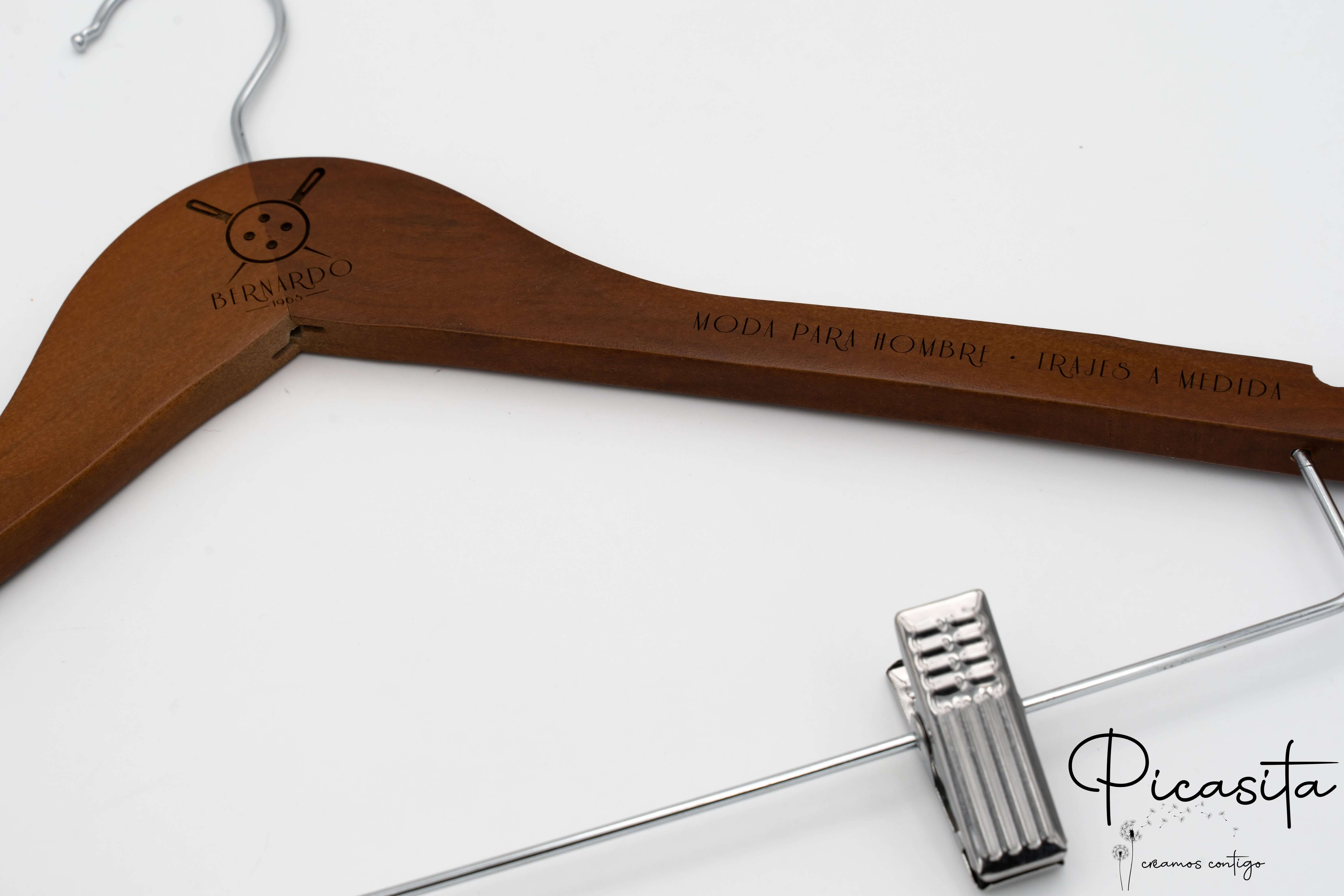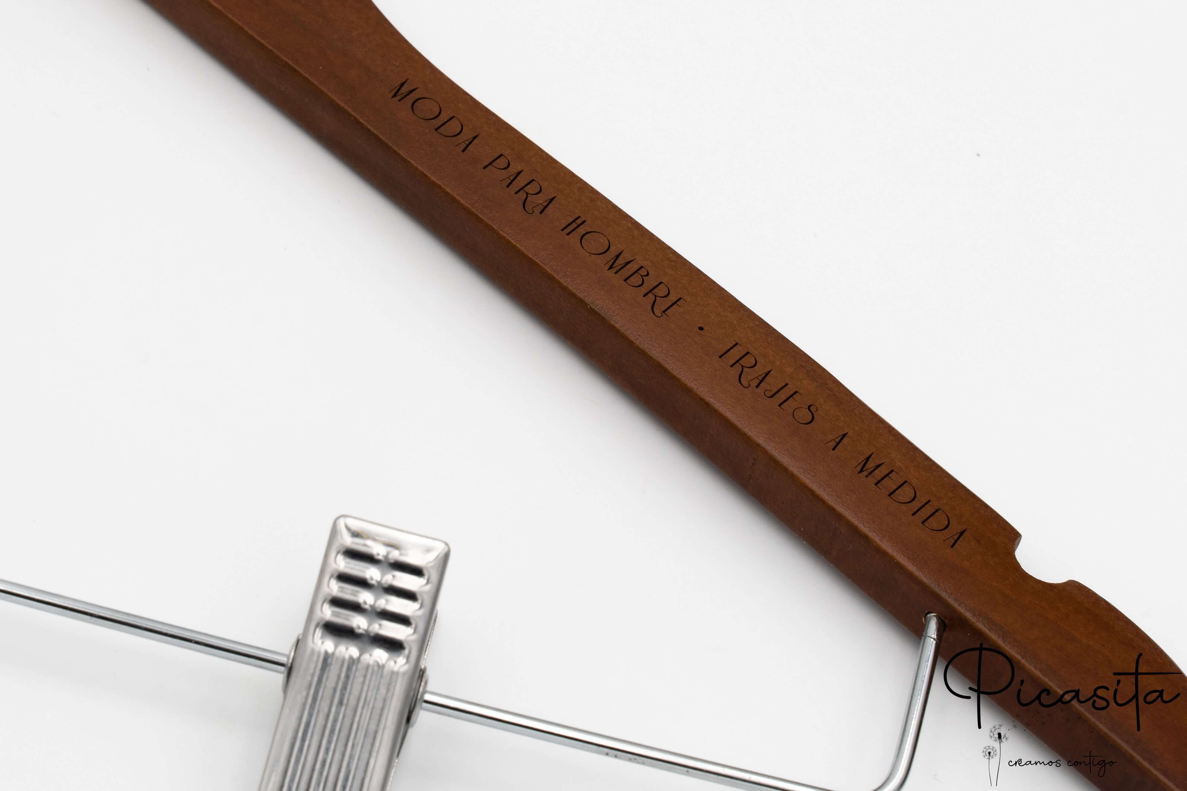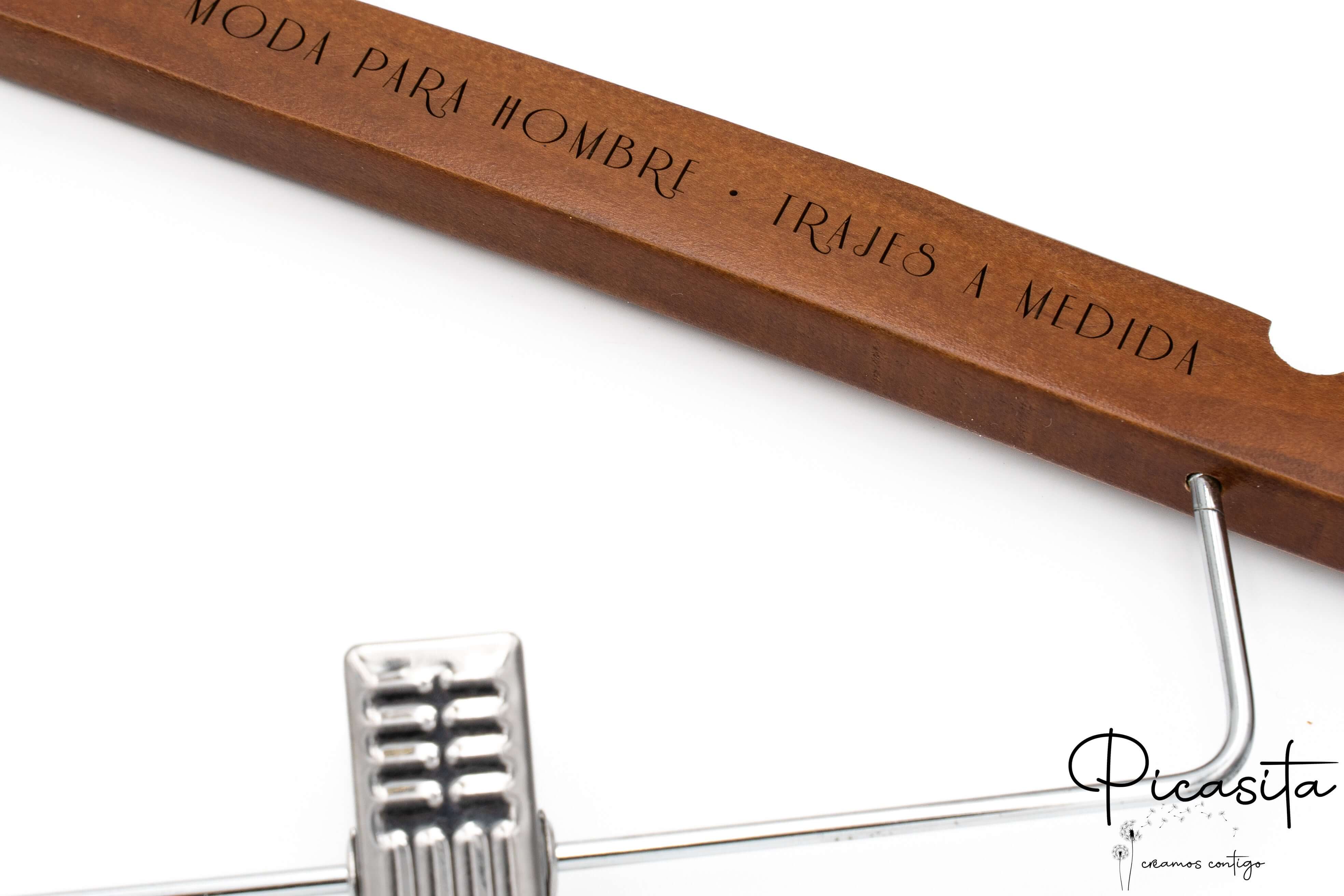 Su Picasita.es siamo specializzati nel rendere ogni oggetto unico. Queste grucce con molletta si personalizzano mediante laser ad alta precisione, ottenendo una finitura monocromatica elegante e permanente. Come si vede nelle immagini di dettaglio, possiamo incidere loghi aziendali, nomi o date speciali sia nella parte centrale (collo) sia sulle braccia della gruccia. È il dettaglio perfetto per matrimoni, eventi o per rafforzare l'immagine del tuo brand di moda.