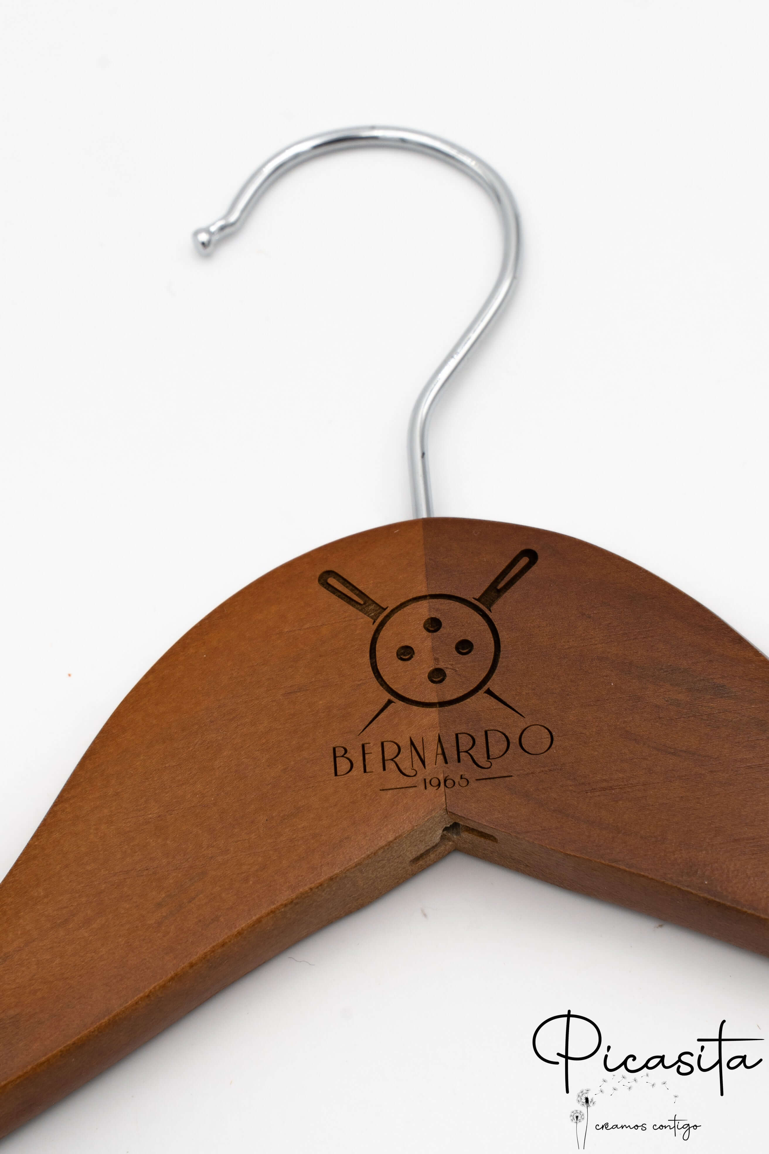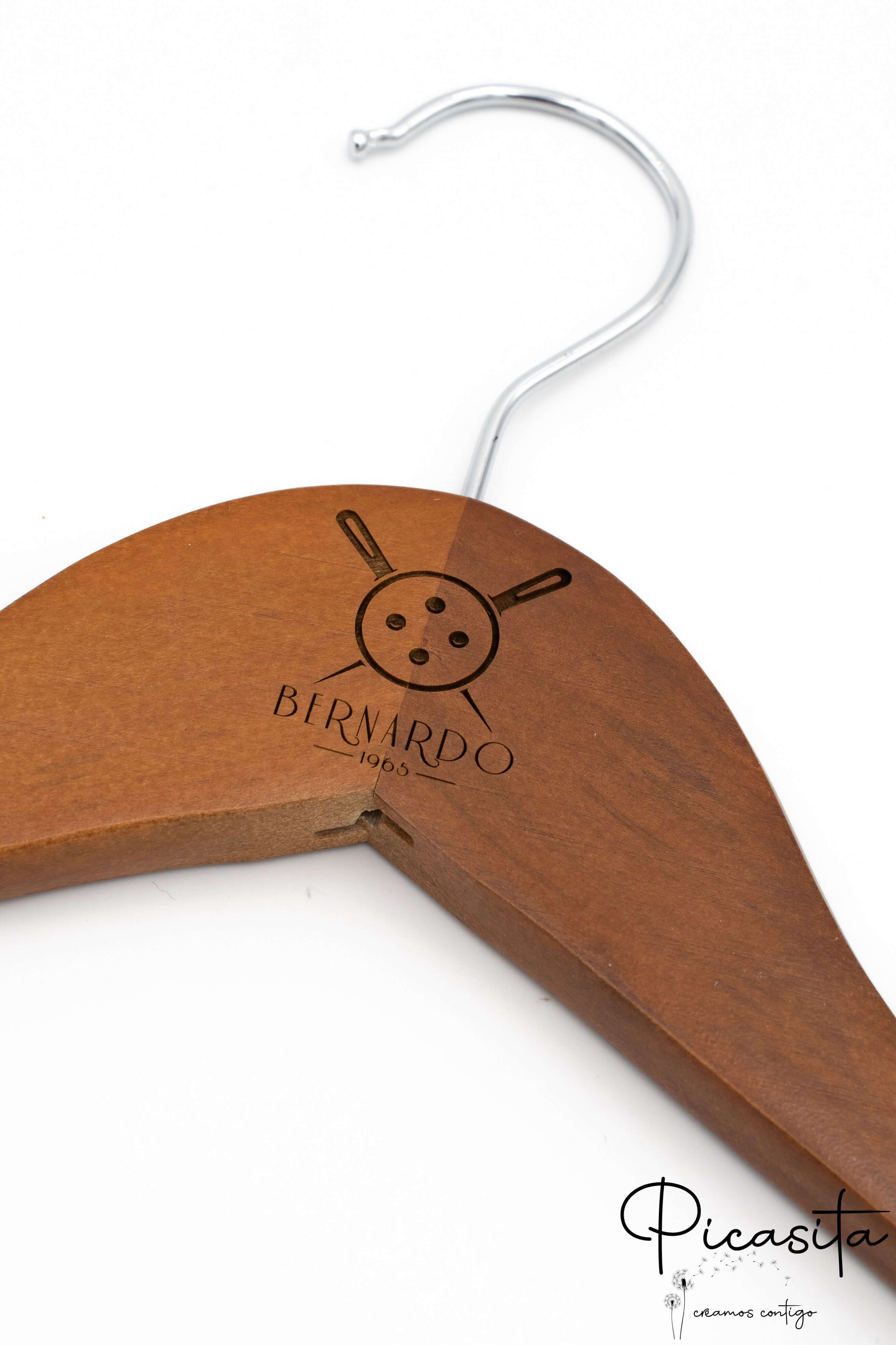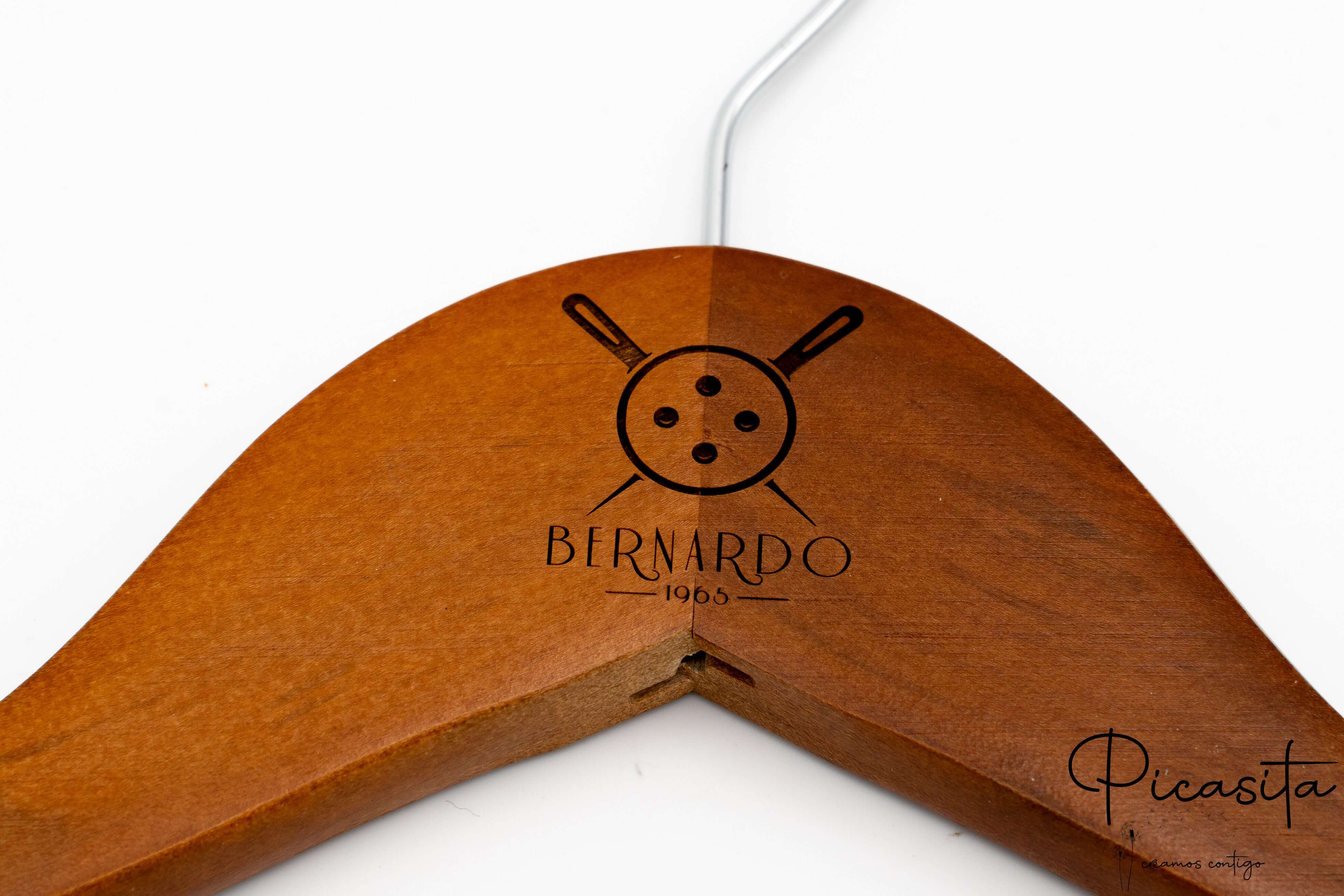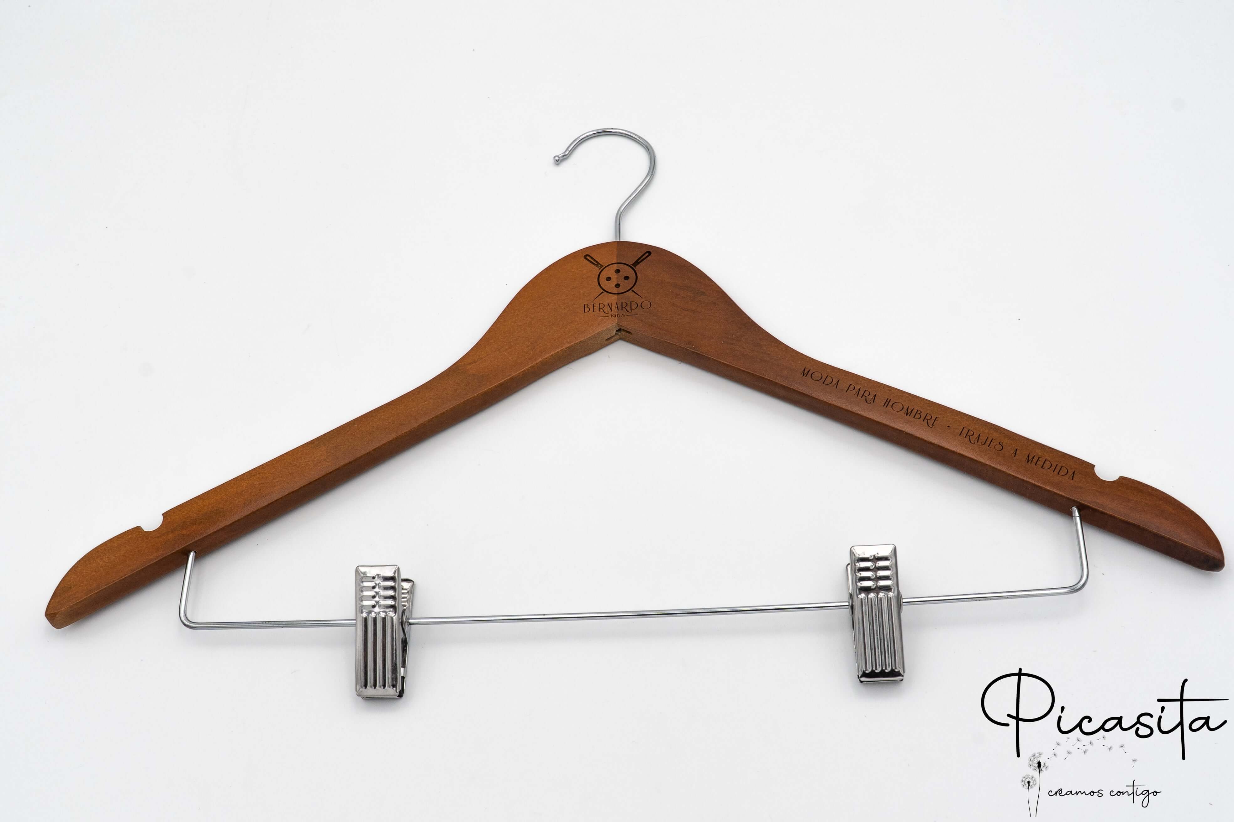 Su Picasita.es siamo specializzati nel rendere ogni oggetto unico. Queste grucce con molletta si personalizzano mediante laser ad alta precisione, ottenendo una finitura monocromatica elegante e permanente. Come si vede nelle immagini di dettaglio, possiamo incidere loghi aziendali, nomi o date speciali sia nella parte centrale (collo) sia sulle braccia della gruccia. È il dettaglio perfetto per matrimoni, eventi o per rafforzare l'immagine del tuo brand di moda.