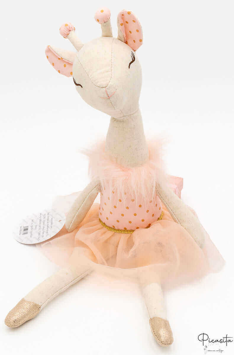 Ciò che distingue questa bambola di pezza è il suo incantevole design ispirato al balletto. Vestita con una delicata gonna di tulle in tonalità rosa pastello e un corpetto abbinato con pois dorati, evoca la grazia e la dolcezza di una prima ballerina. Il collo è adornato con un morbido dettaglio di piume, aggiungendo un tocco di sofisticazione e fantasia. Ogni elemento è stato accuratamente selezionato per creare un aspetto armonioso e affettuoso.