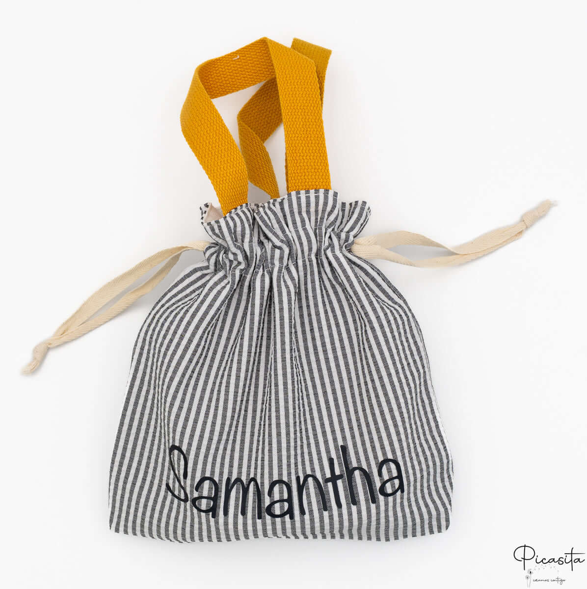 Da Picasita sappiamo che la durabilità è fondamentale. Per questo, ogni borsa personalizzata viene realizzata utilizzando vinile termoadesivo di alta qualità. Questa tecnica garantisce che il nome rimanga saldo e leggibile nonostante il trambusto quotidiano nello zaino o al parco. Per questo design specifico, utilizziamo esclusivamente il carattere Noteworthy, che dona uno stile manoscritto, allegro e molto facile da riconoscere per i bambini. È importante sottolineare che, per mantenere l'estetica originale ed equilibrata del prodotto, non sono ammessi cambiamenti nel tipo di carattere.