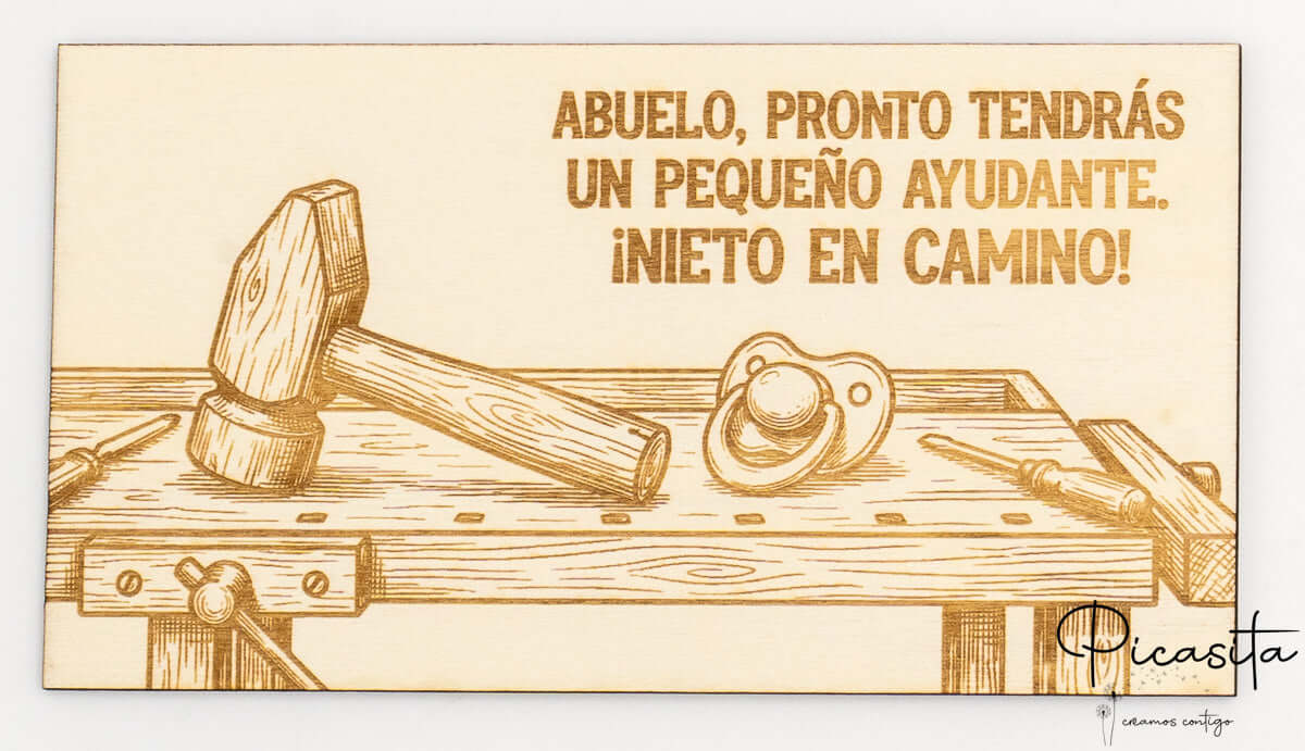Non c'è notizia che generi più impatto e gioia che dire vais a ser abuelos o vais a ser tios. Con le nostre targhe in legno, il messaggio rimane immortalato in modo fisico e tangibile. Ogni design è accuratamente illustrato per connettersi con la persona che lo riceve. Che tu voglia dire a tuo padre "vas a ser abuelo" con un affettuoso design di attrezzi, o a tua madre "vas a ser abuela" con un dolce ricettario d’amore, abbiamo l’opzione ideale. La incisione laser offre una finitura rustica, elegante e altamente duratura, bruciando il legno in modo sottile per rivelare una tonalità marrone scuro che contrasta perfettamente con la base chiara della targa.