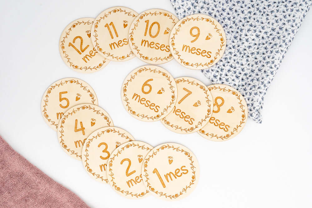 Dischi Compleanno Mensile: Set di dischi in legno in spagnolo per fotografare il primo anno.