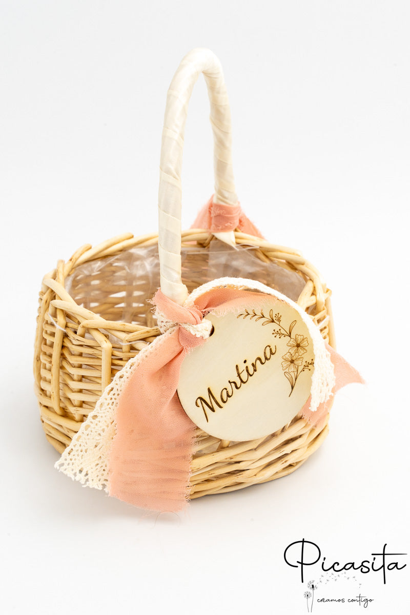 Per aggiungere un tocco di sofisticazione e tenerezza, ogni cesta per damigelle d'onore è decorata con bellissimi nastri di stoffa (che includono fiocchi con bordi sfrangiati in stile boho, delicati dettagli in pizzo) e una splendida medaglia rotonda in legno naturale che pende dal manico. Alcuni dei nostri modelli includono una pratica fodera interna in tessuto bianco o un rivestimento in plastica trasparente, ideale per proteggere l’interno se decidi di usare il cesto per damigelle con fiori con petali naturali o artificiali che puoi scoprire esplorando Il Nostro Negozio.