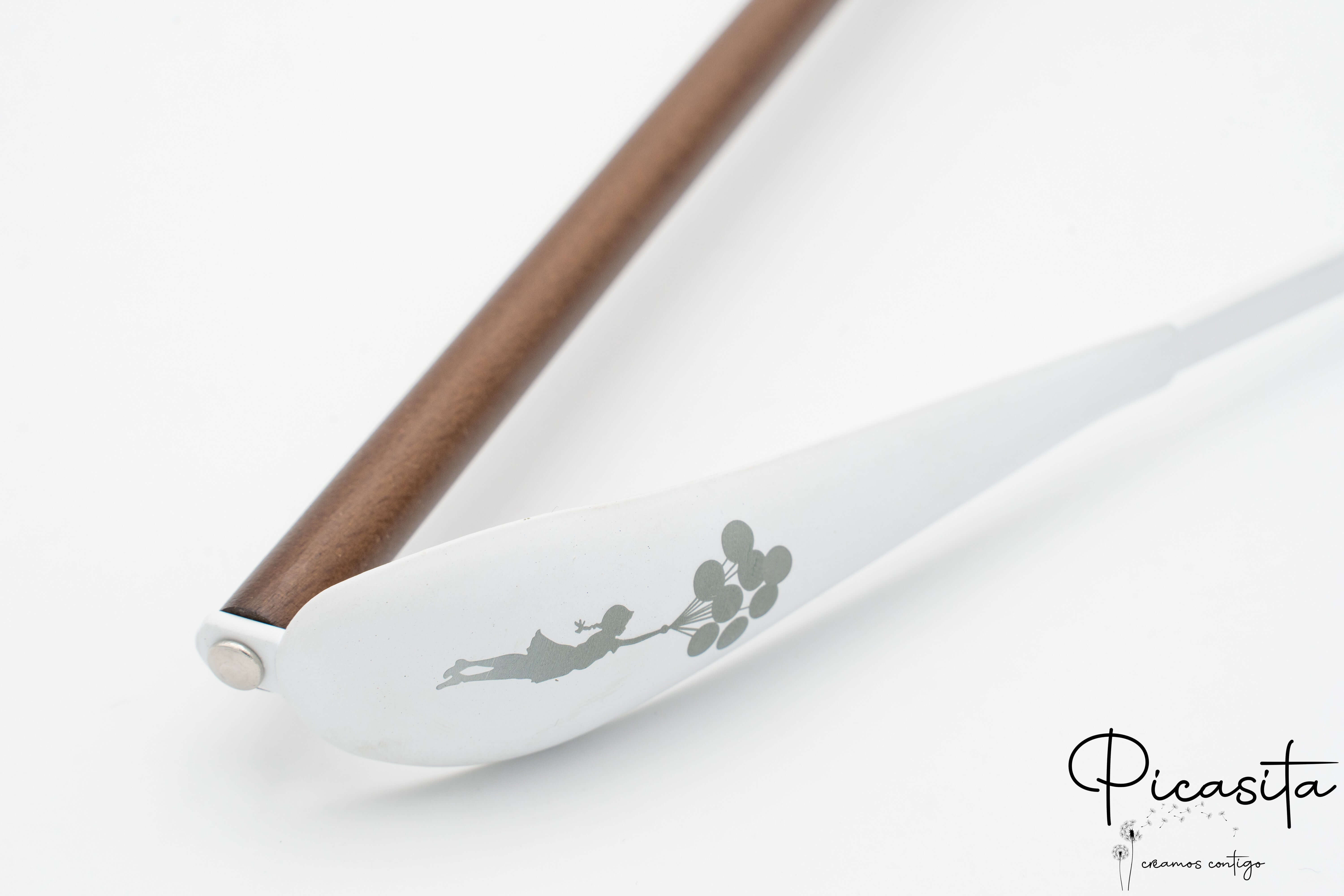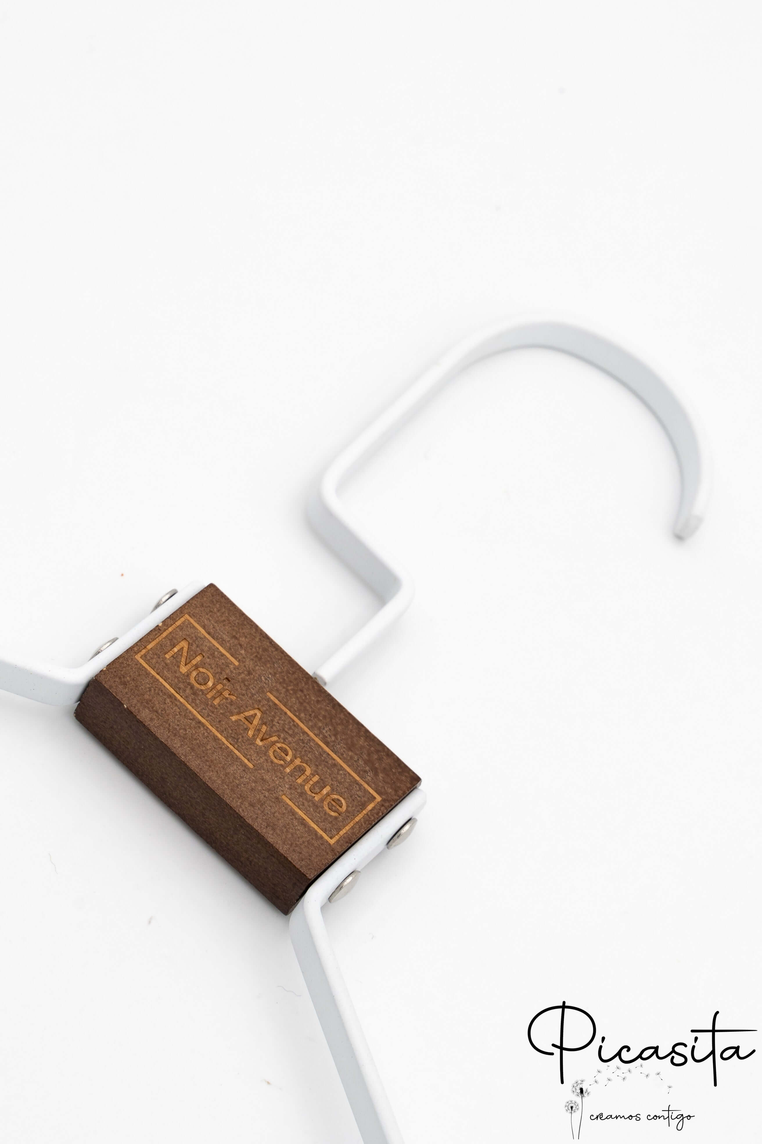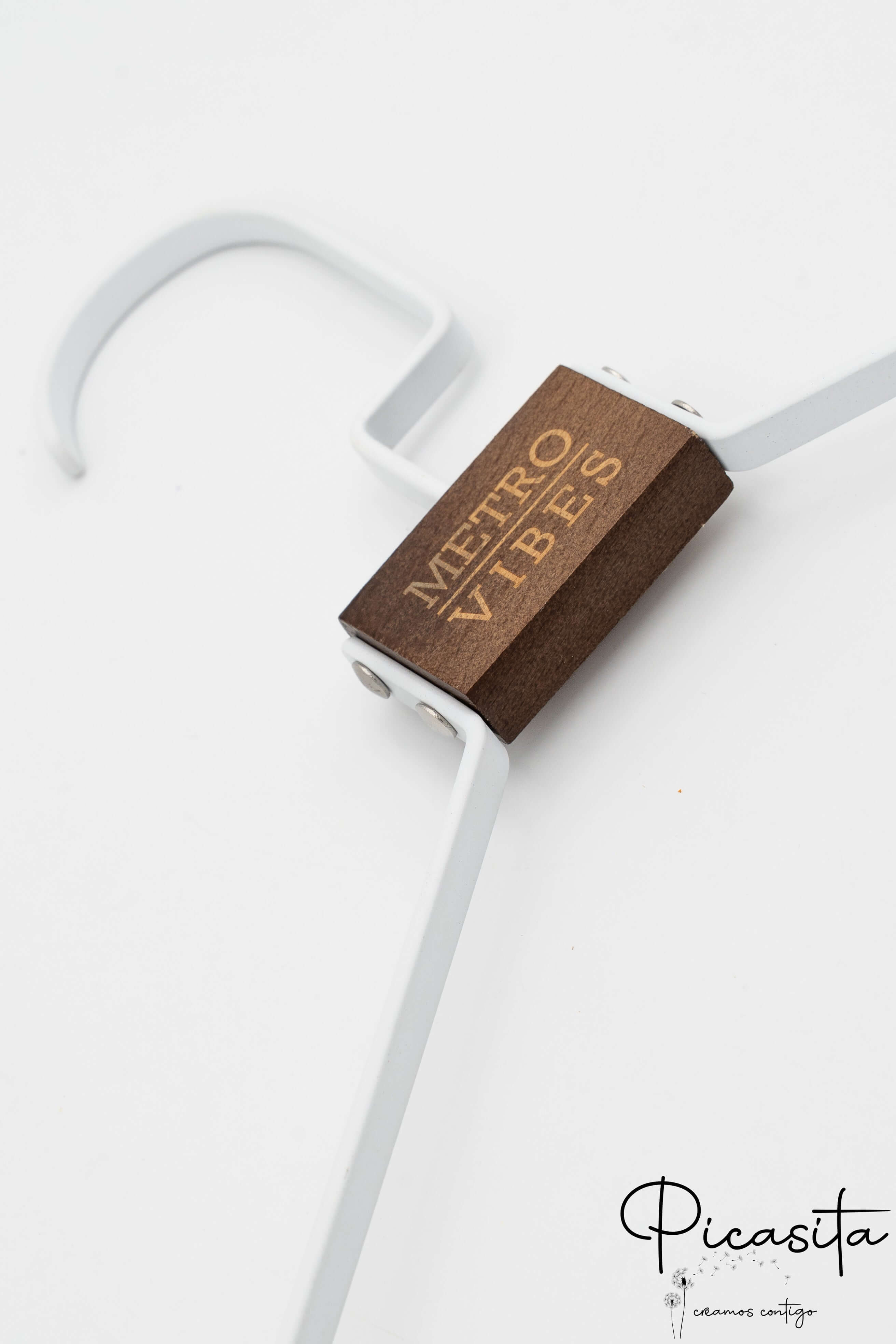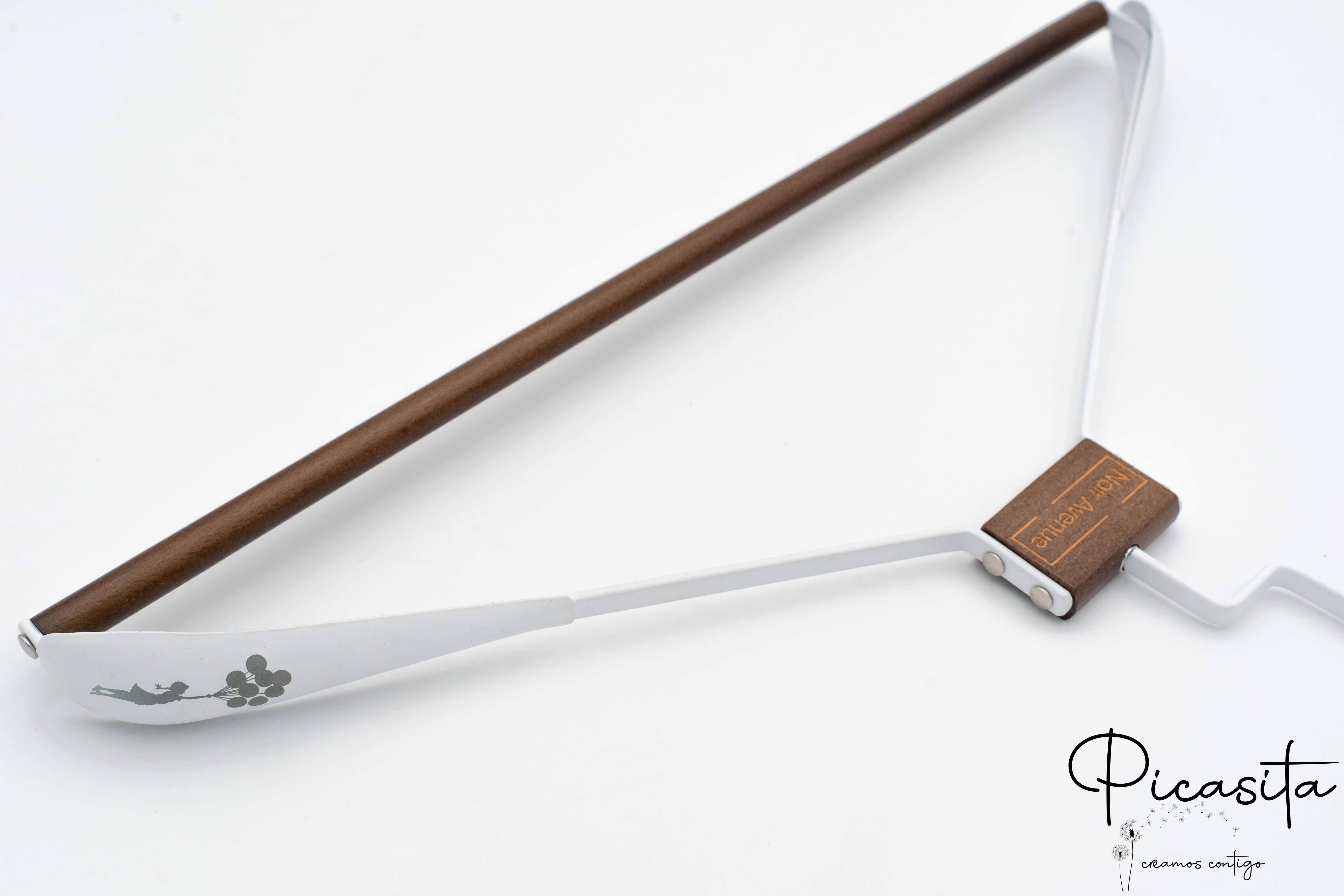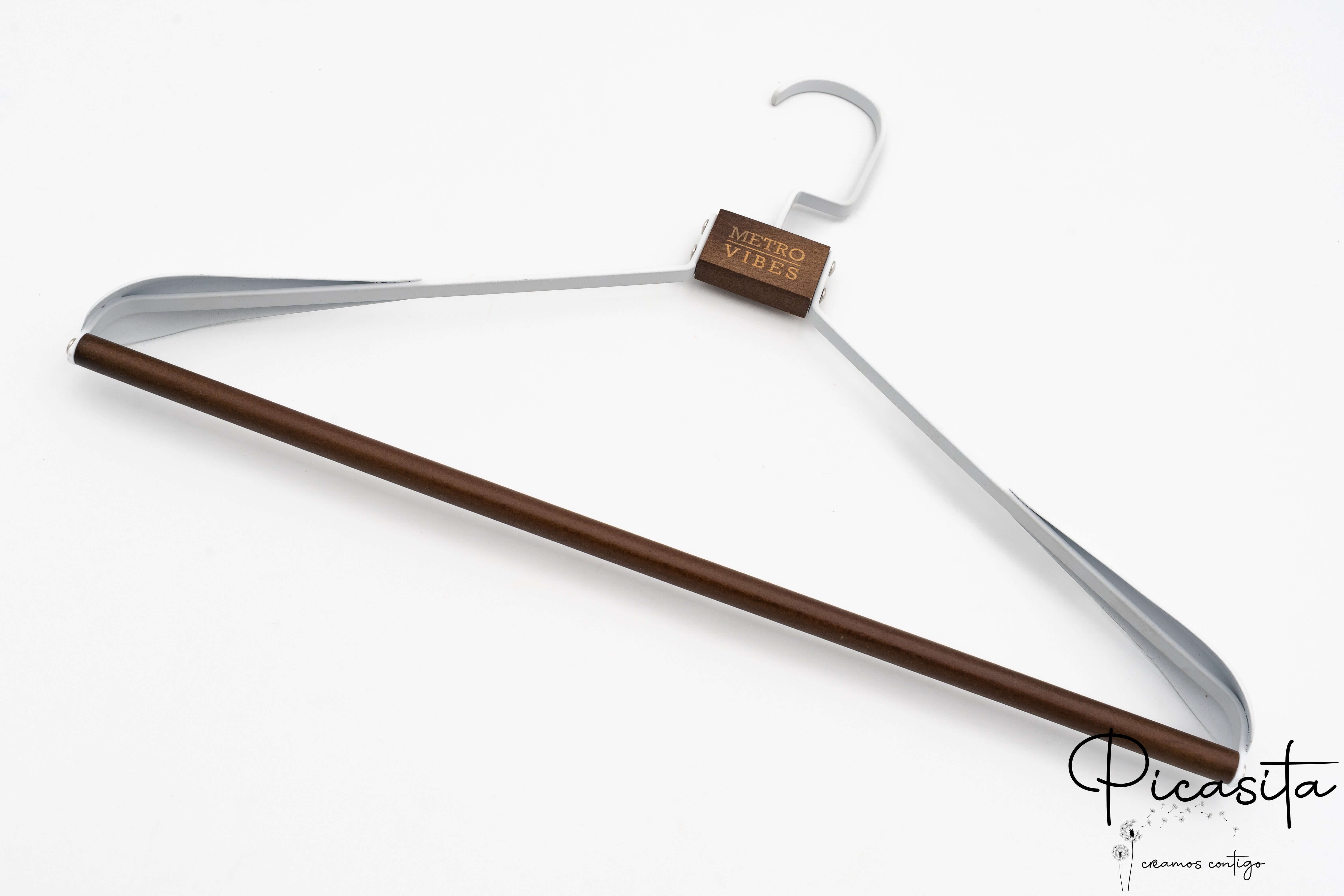 Di serie incidiamo il legno superiore. Tuttavia, previa consultazione e con un piccolo supplemento, possiamo incidere la zona metallica delle spalle o il gancio appendiabiti per un design totalmente unico.
