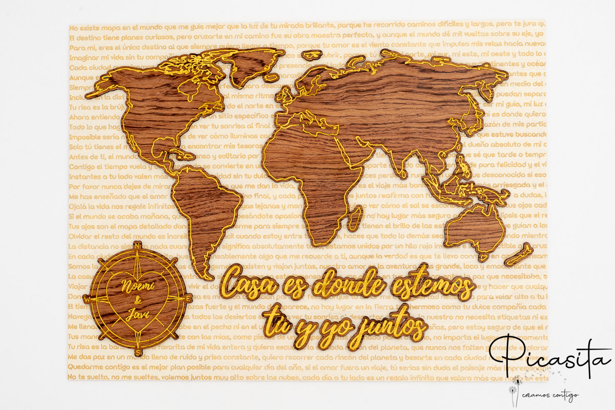 Sappiamo che i dettagli contano. Per questo, questo disegno include una bussola a forma di cuore dove immortaliamo i vostri nomi. Scegliendo questo regalo personalizzato di San Valentino, stai creando un ricordo tangibile delle vostre avventure insieme sotto il motto "Casa è dove siamo io e te insieme".