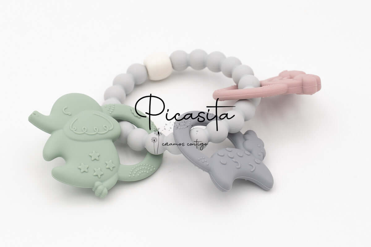 Quando cerchi il miglior succhietto per bebè, la qualità del materiale è assolutamente fondamentale. Il nostro prodotto è realizzato interamente come un succhietto in silicone di grado alimentare premium, garantendo che sia completamente privo di BPA, ftalati e piombo. Il suo design ergonomico si distingue per un anello centrale formato da morbide perline rotonde, da cui pendono tre adorabili figure in tonalità pastello: un tenero elefante, un simpatico dinosauro e un magico arcobaleno. Queste figure presentano diverse texture e rilievi sulla superficie, ideali per massaggiare le gengive infiammate mentre stimolano lo sviluppo sensoriale e il riflesso di presa delle manine più piccole.