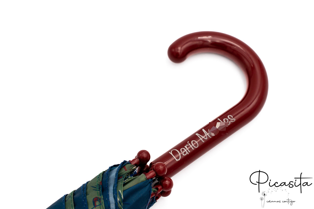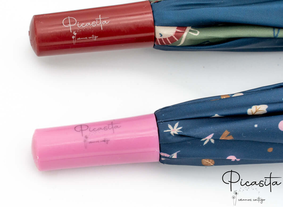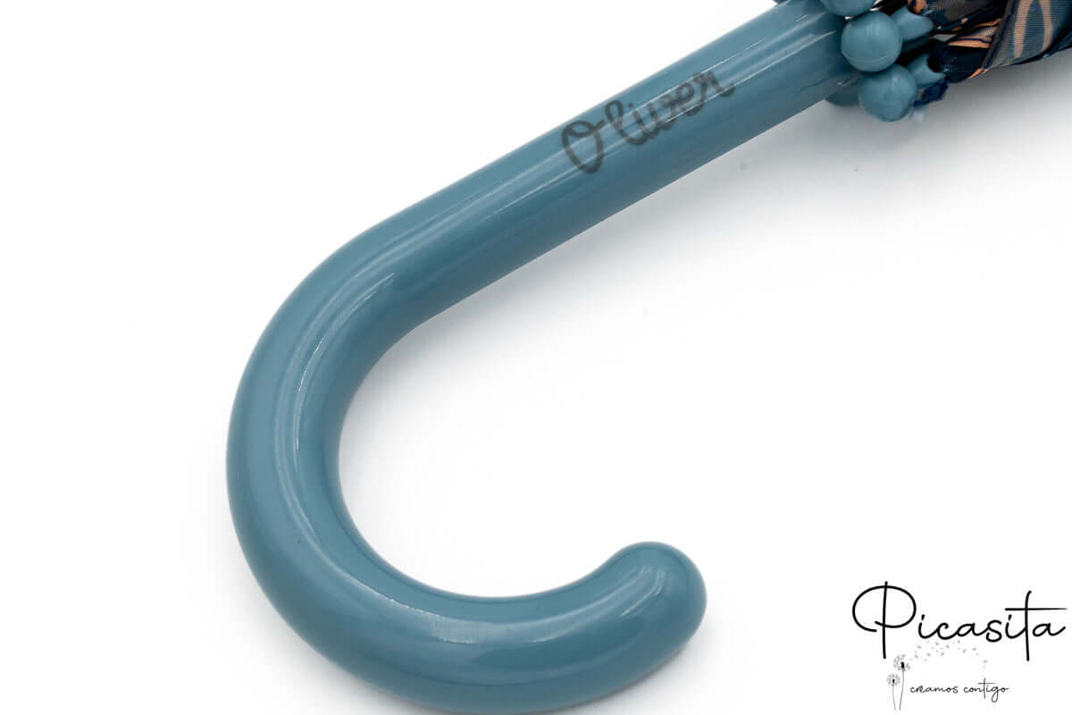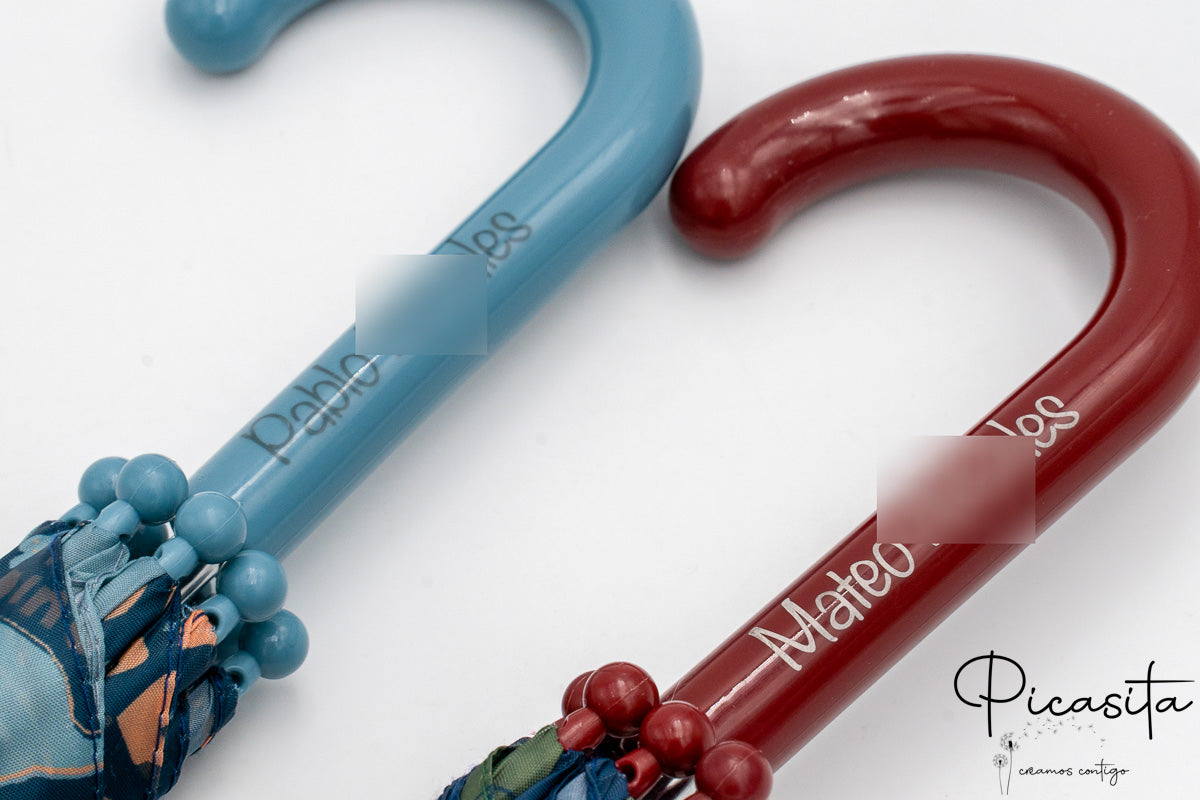 Per evitare confusioni nel cortile o nell'attaccapanni della scuola, niente è meglio di un ombrello per bambini con nome. Dimentica adesivi che si staccano con l'umidità o pennarelli che si cancellano. Da Picasita realizziamo un'incisione tramite laser ad alta precisione direttamente sul manico curvo. Questo metodo garantisce una finitura monocromatica elegante che non si deteriora col passare del tempo né per il contatto costante con l'acqua. Anche se cerchi un ombrello per bambini con nome (sappiamo che a volte la fretta nel cercare ci gioca brutti scherzi con la tastiera), qui troverai la massima qualità di personalizzazione.