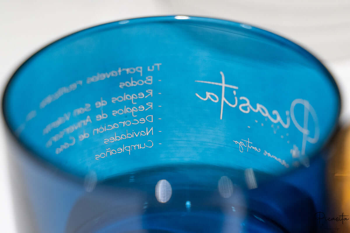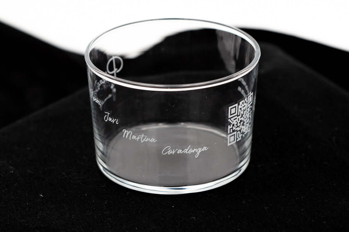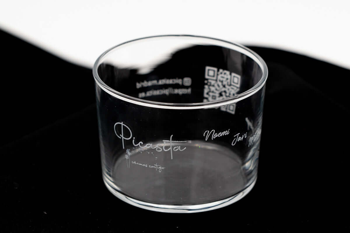 Per rendere ogni pezzo unico, utilizziamo tecnologia laser ad alta precisione. Questo metodo non aggiunge inchiostri né adesivi, ma erode il vetro per creare una finitura monocromatica in toni grigi o bianchi opachi che è totalmente permanente. Possiamo incidere nomi degli sposi e date per un matrimonio, loghi aziendali, filigrane floreali, messaggi di pensionamento o i soprannomi di tutta la tua comitiva.