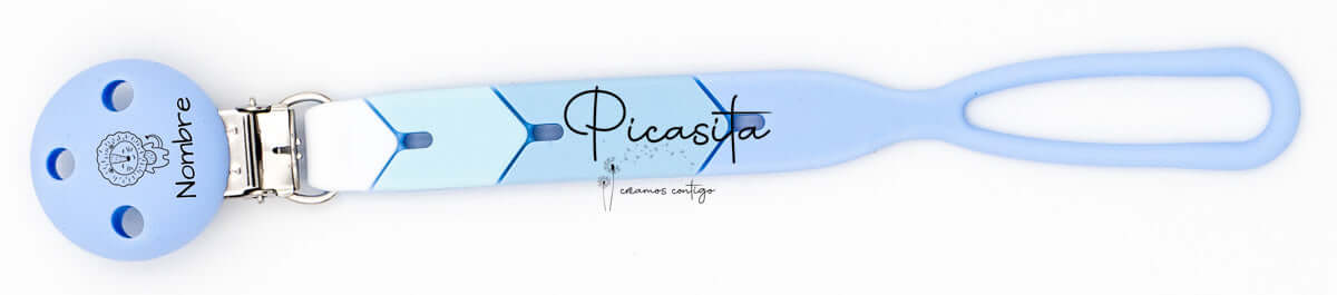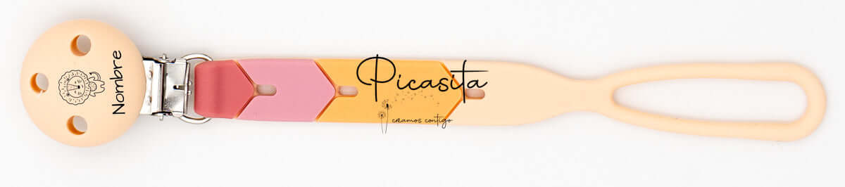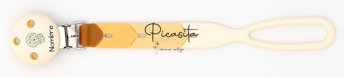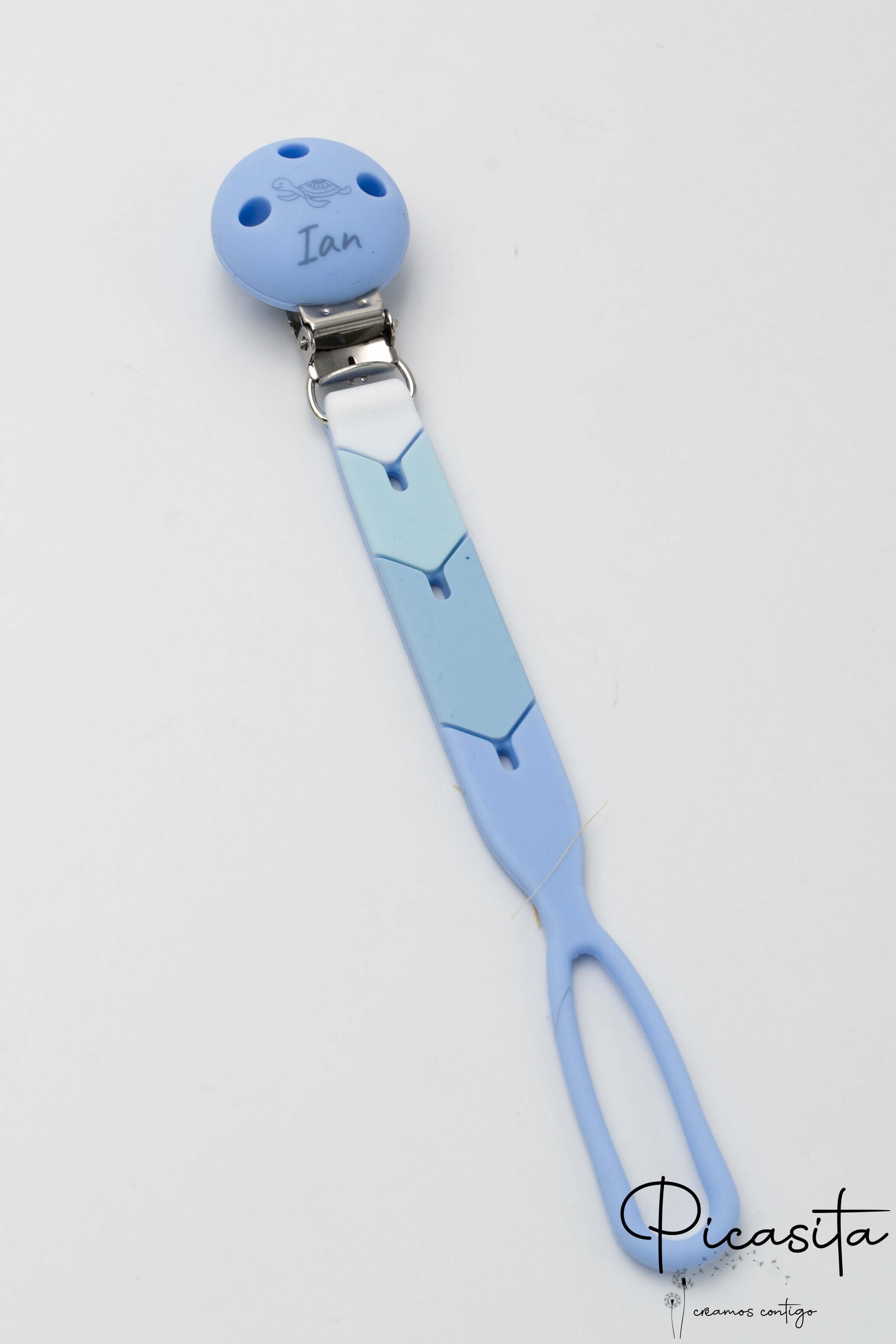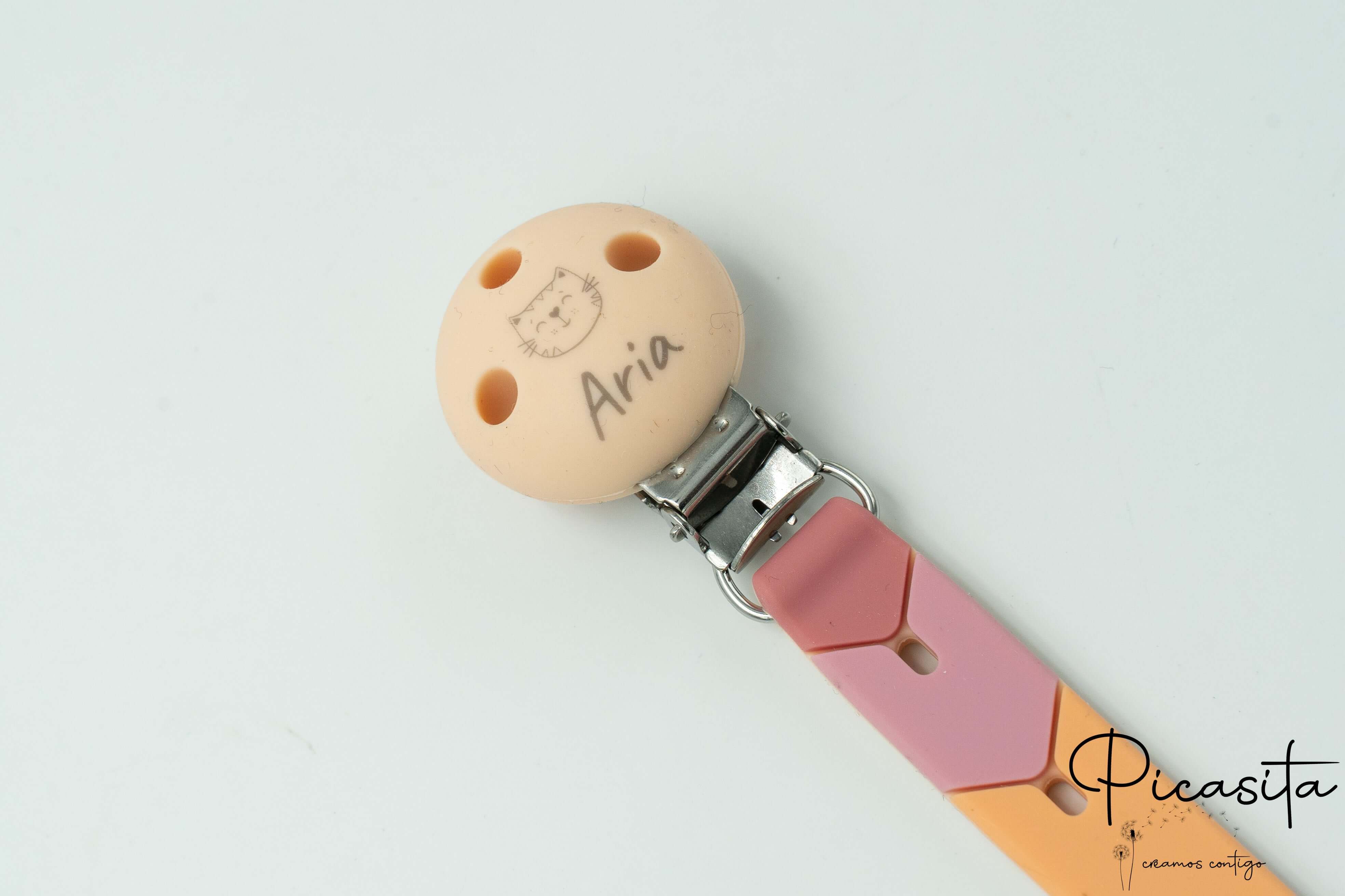 Ciò che rende speciale questo portaciuccio in silicone è la possibilità di renderlo unico. Il clip di fissaggio è personalizzabile tramite laser ad alta precisione. Questo metodo offre un risultato monocromatico in tono grigio scuro che è permanente: non si cancella né utilizza inchiostri. Puoi incidere il nome di tuo figlio insieme a icone di animaletti come la tartaruga, il gattino o il leone, trasformando il tuo portaciuccio colorato in un ricordo indelebile.