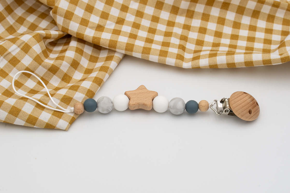 Il materiale è sicuro se il mio bambino lo porta in bocca?Assolutamente sì. Utilizziamo silicone di grado alimentare privo di BPA e ftalati conforme alla normativa REACH. Il legno di faggio è naturale e il clip da 35mm è sicuro per il contatto con il bambino.