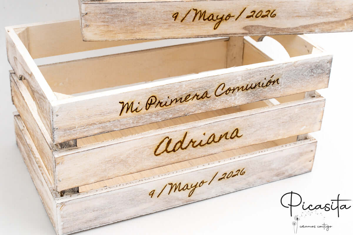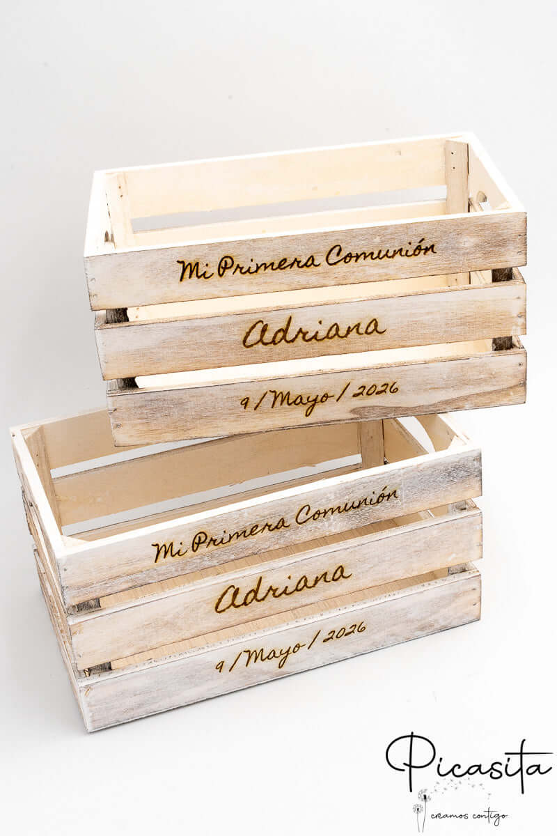 La dolcezza dell’infanzia e le celebrazioni familiari meritano di essere incorniciate con materiali nobili. Per questo abbiamo concepito questo design come la perfetta scatola rustica per dettagli di Prima Comunione. Con le sue dimensioni versatili (dalla Piccola Pino di 22x15x10 cm alla Grande Bianca di 26x16x13 cm) e le pratiche maniglie laterali, è estremamente comoda per distribuire i ricordi ai familiari. Ogni scatola di legno si integra nella decorazione apportando un valore estetico superiore, trasformando lo spazio in un ambiente pieno di luce e allegria.