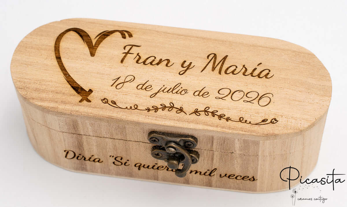 Sappiamo che organizzare un matrimonio richiede di bilanciare il budget senza sacrificare la bellezza né la qualità dei dettagli. Per questo, se stai cercando una scatola per anelli economica, questo modello è la scelta definitiva. Il suo interno completamente libero ti offre la libertà di posizionare le fedi su un piccolo cuscino di juta, muschio naturale o direttamente sul caldo legno levigato. La chiusura metallica in ottone invecchiato non solo valorizza l’estetica vintage, ma assicura che tutto rimanga protetto durante l’evento, offrendoti totale tranquillità nel momento più importante della cerimonia.