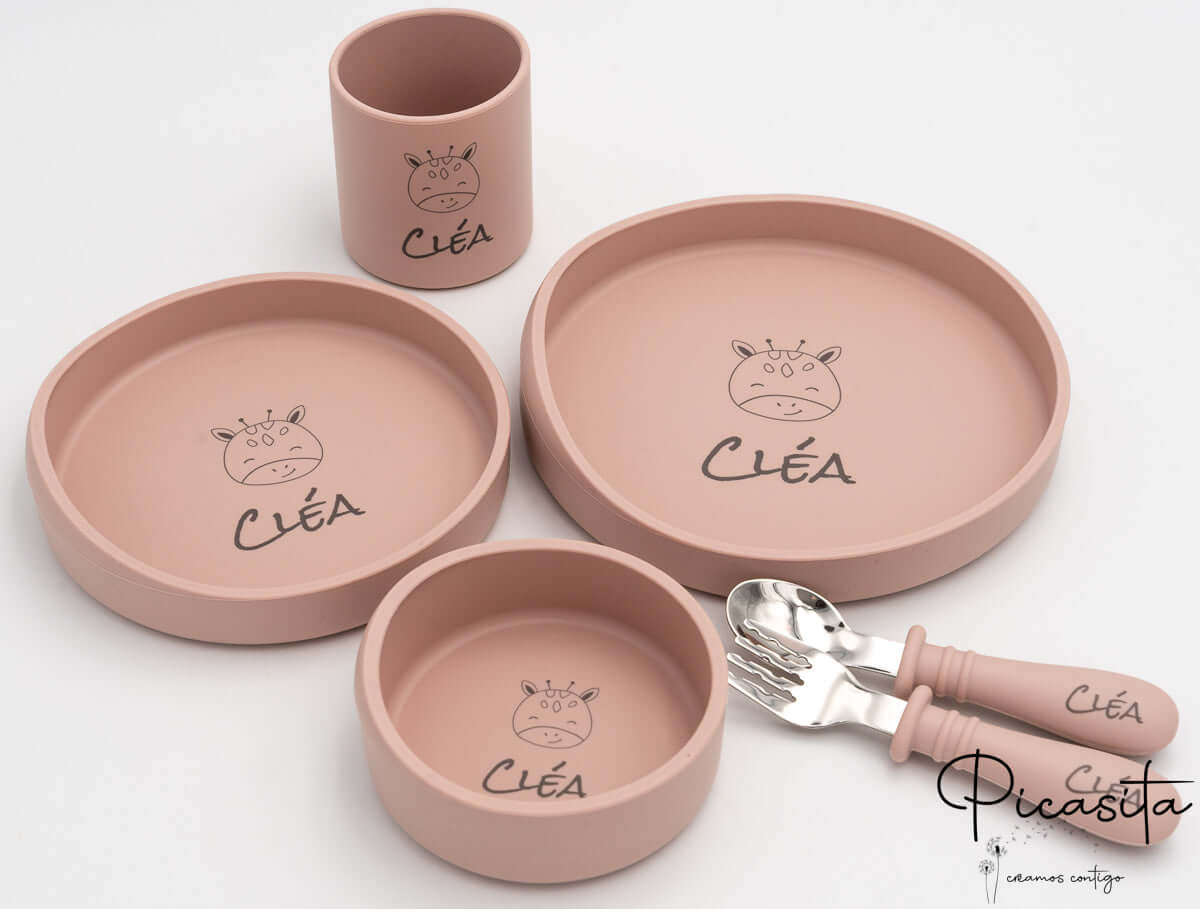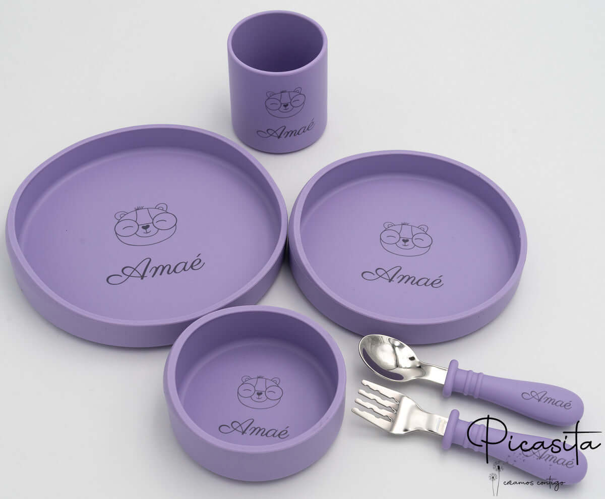 Questo set completo di 6 pezzi include tutto il necessario per le diverse fasi e tipi di alimentazione: un piatto da 170mm, uno da 150mm per porzioni più piccole, una ciotola da 100mm ideale per puree o cereali, un bicchiere infrangibile e due posate per l’apprendimento. Questi piatti per bambini sono personalizzati tramite una precisa incisione laser. Questa tecnica brucia leggermente la superficie del silicone, lasciando un’elegante e indelebile traccia di colore grigio scuro. Non utilizzando inchiostri né adesivi, garantiamo che la personalizzazione durerà lavaggio dopo lavaggio, essendo completamente sicura per l’uso in microonde e lavastoviglie.
