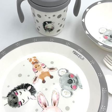 Il set completo di 5 pezzi include: un piatto piano, una ciotola profonda, un bicchiere di apprendimento con tappo antigoccia e manici ergonomici, una forchetta con punte arrotondate e un cucchiaio.