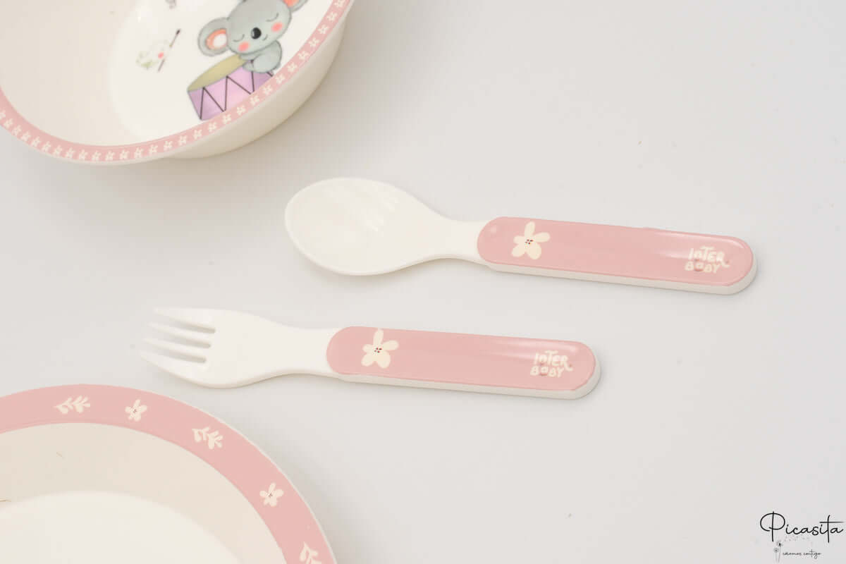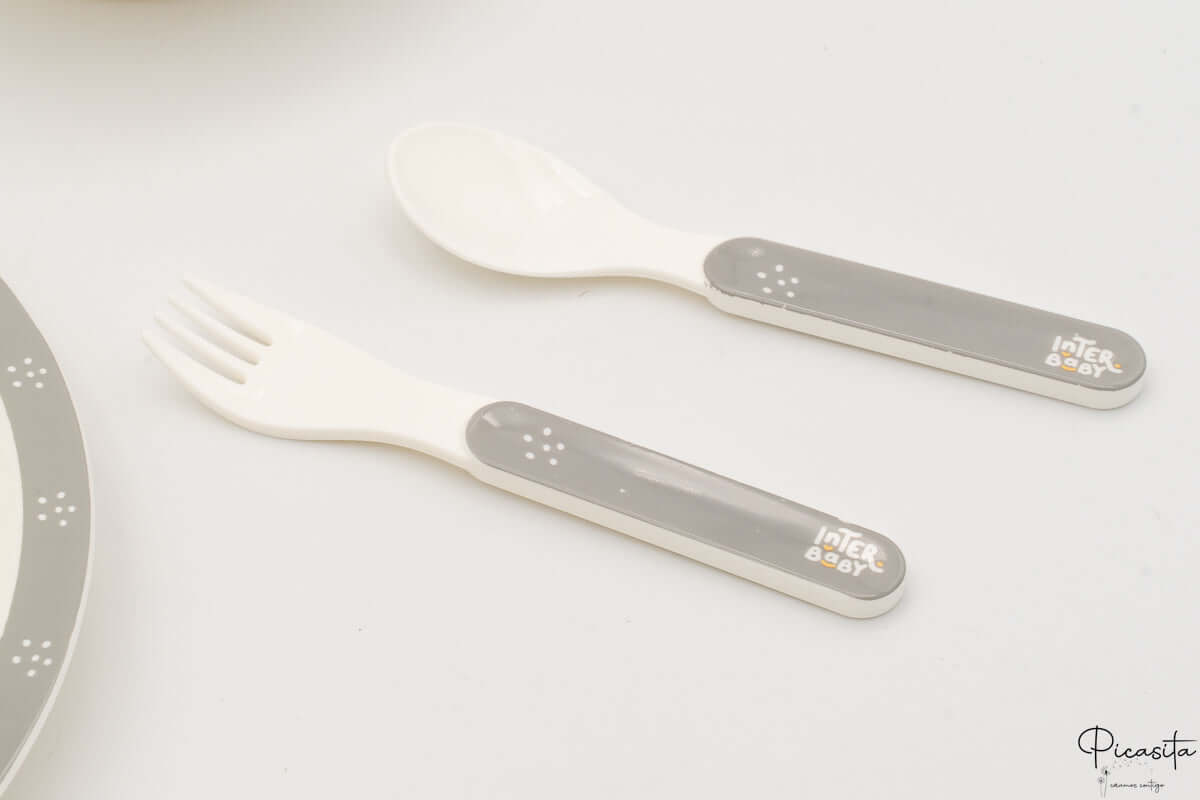 Posate ergonomiche: Un cucchiaio e una forchetta con manici larghi affinché il set di piatti per bambini sia facile da maneggiare fin dal primo giorno.