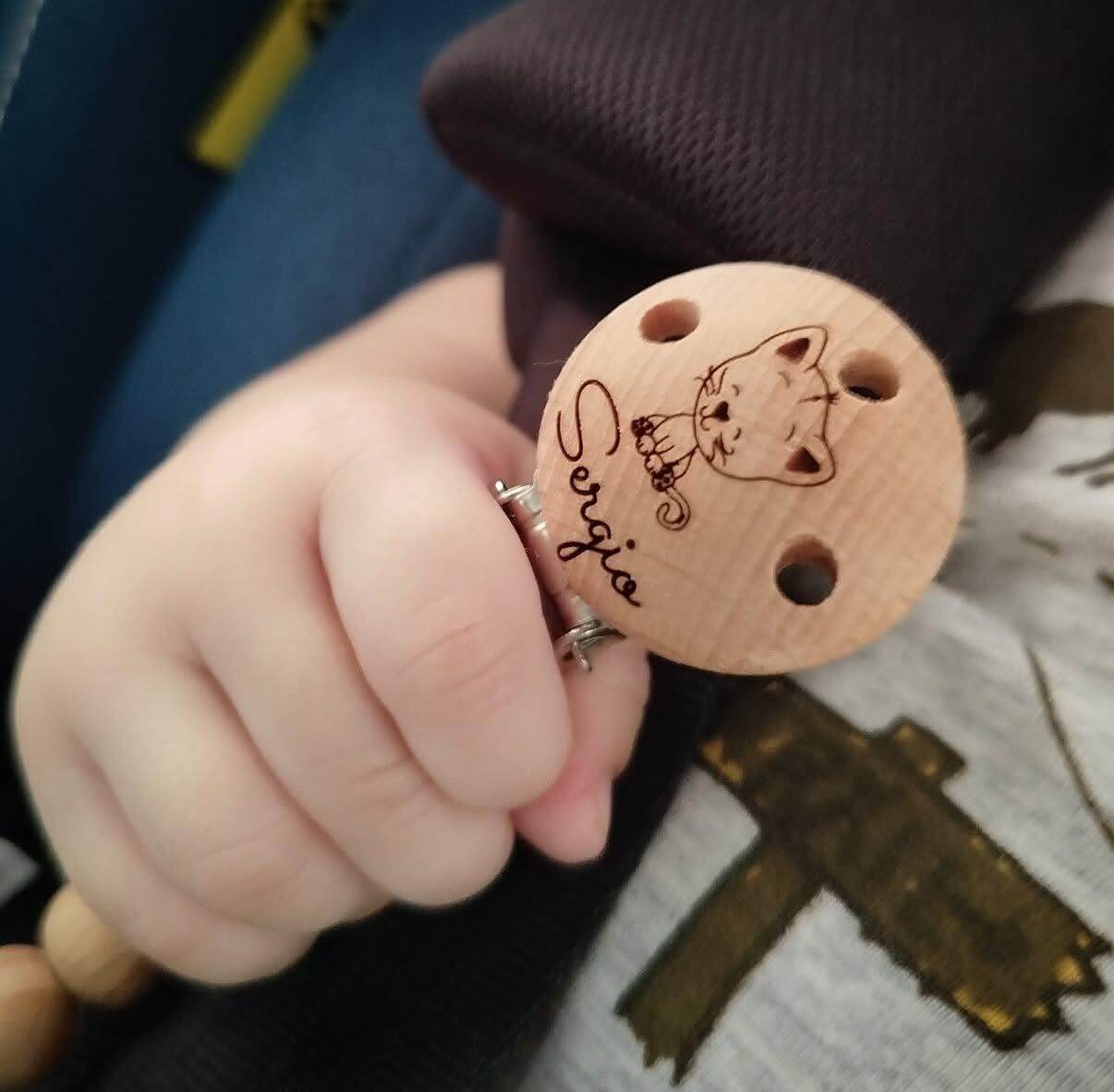 Personalizamos el clip del chupetero mediante grabado láser de alta precisión. Esto quema la madera dejando el nombre y el dibujo en un tono oscuro, sin utilizar tintas ni pegatinas que puedan desprenderse.