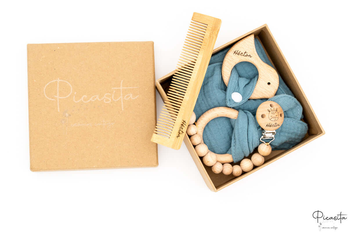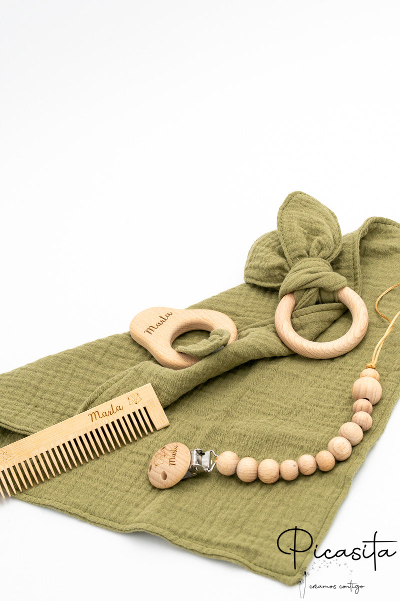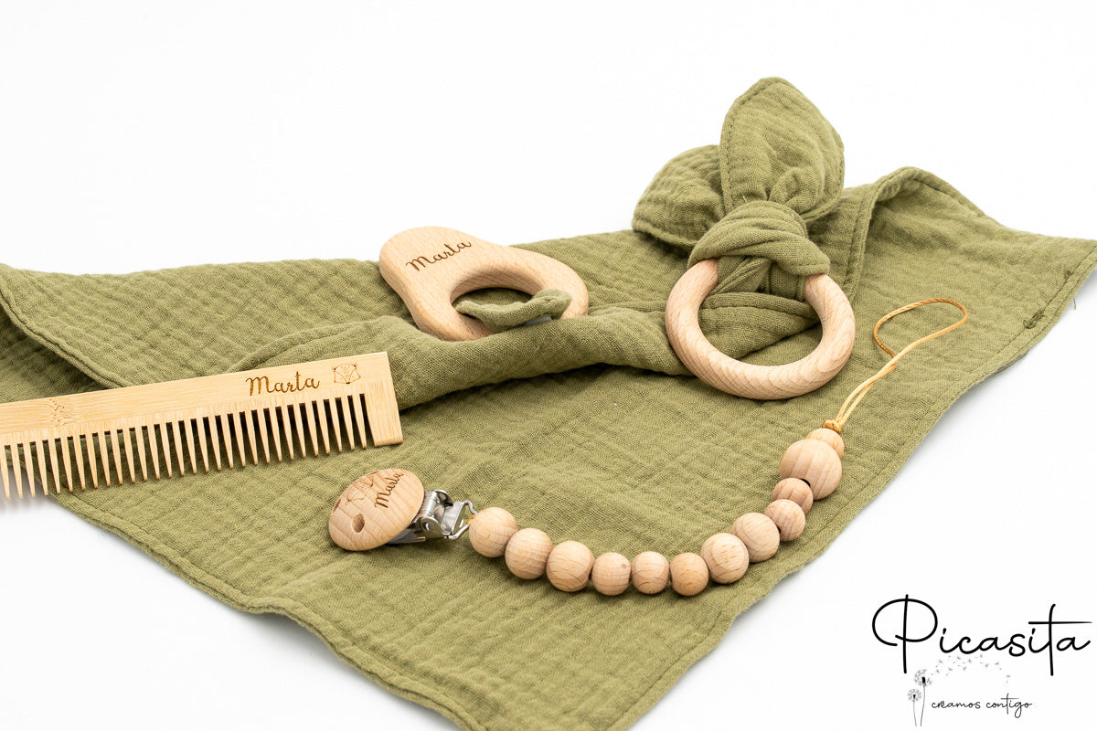 Elegir este conjunto de chupetero, muselina y mordedor garantiza que estás regalando calidad certificada. Ya sea en color Beige, Verde, Azul o Rosa, cada pieza se coordina estéticamente para crear armonía visual. Es el regalo recien nacido definitivo para Baby Showers o primeras visitas, destacando por encima de opciones genéricas gracias a la calidez de la madera y la personalización artesanal.