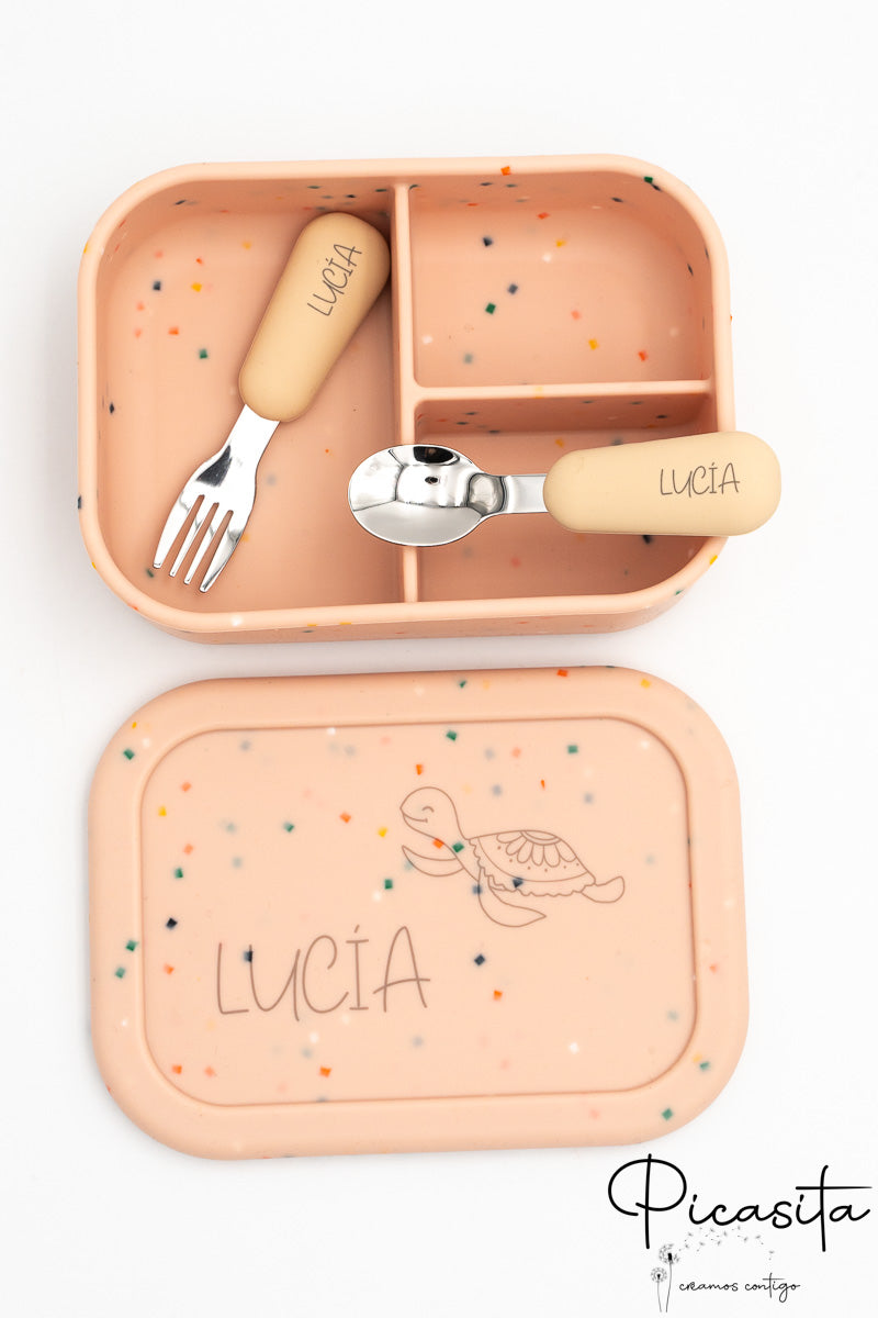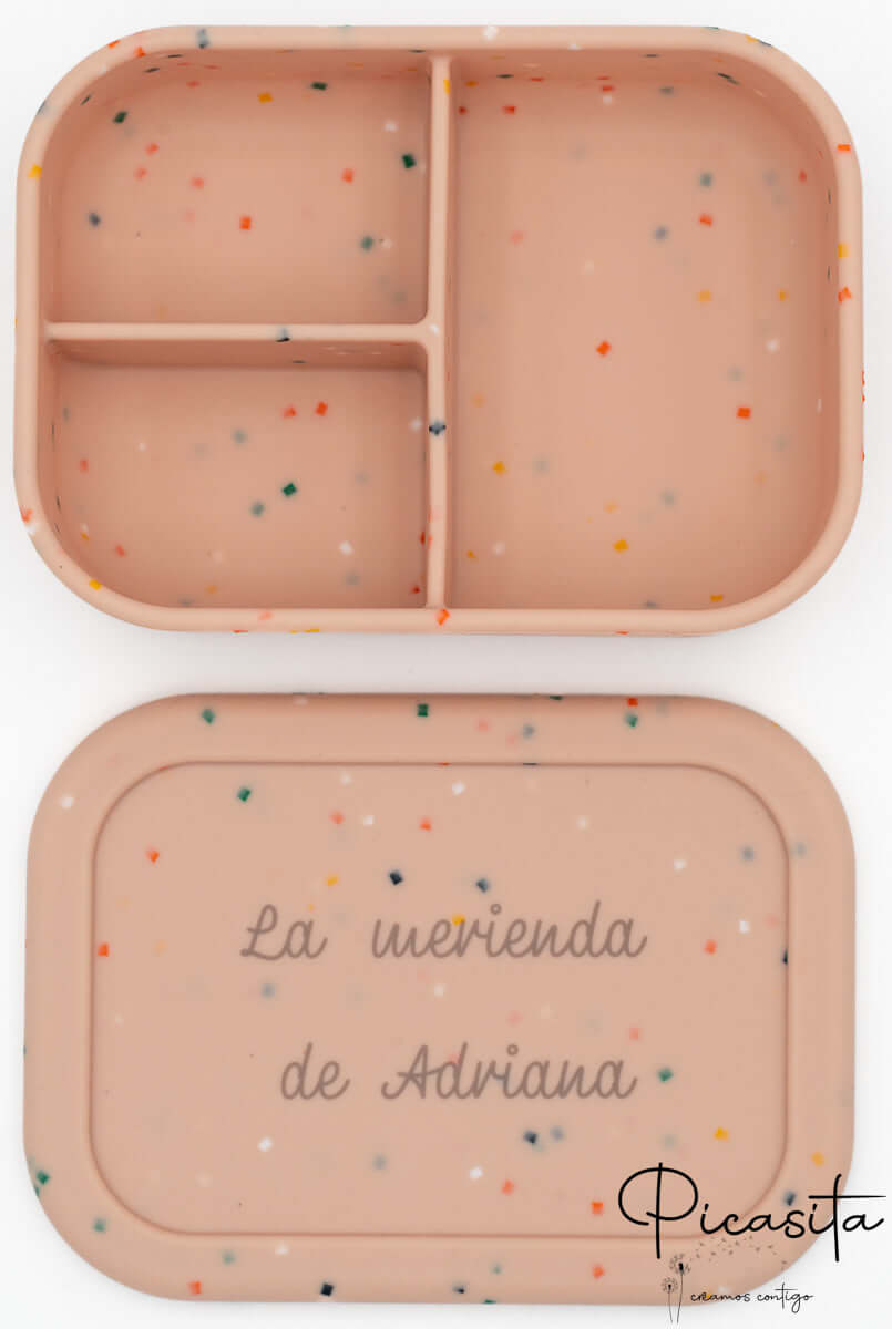 Disponibile in una bellissima gamma di colori per tutti i gusti: Beige con Scintille, Rosa con Scintille, Verde con Scintille, Lilla, Rosa Scuro, Blu-Grigio e Rosa Chiaro. Inoltre, puoi abbinarlo alle nostre posate in silicone (non incluse) per completare il tuo set di stoviglieria personalizzata. La cosa migliore è che, gestendo tutto da Móstoles, spediamo il tuo ordine il giorno successivo al ricevimento, già personalizzato e pronto all'uso.
